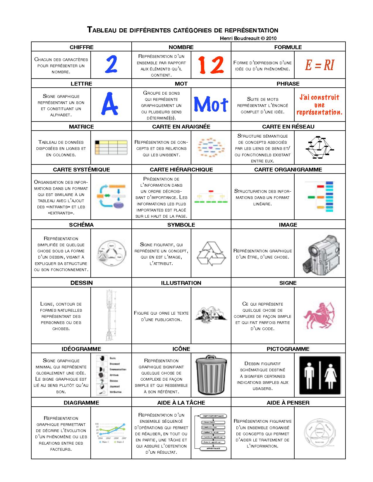 L’un des chantiers didactiques majeurs en didactique professionnelle est la conception d’aides à penser, d’aides à la tâche et d’aides à se comporter. Tous ces aides ont pour but d’aider l »enseignant à expliciter les savoirs et à l’apprenant de se construire ses propres représentations à partir de celles proposées par l’enseignant. Je vous présente ici une petite compilation de ce que j’identifie comme types de représentations. Bon travail.