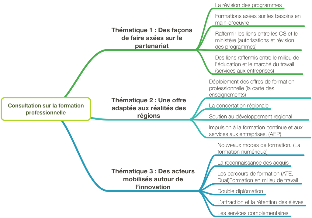 Ce qui était important c’était de se préoccuper des technologies de l’information, de la formation à distance, de la formation à temps partiel, de la formation en entreprise, des besoins en main-d’oeuvre, du financement et surtout des compétences du 21e siècle. Comment se préoccuper des compétences du 21e siècle quand celles du 20e siècle n’ont pas encore été développées ? Comment considérer ces compétences avec des reconnaissances axées sur l’augmentation des diplômés et les besoins pointus des régions au détriment du développement des élèves ?