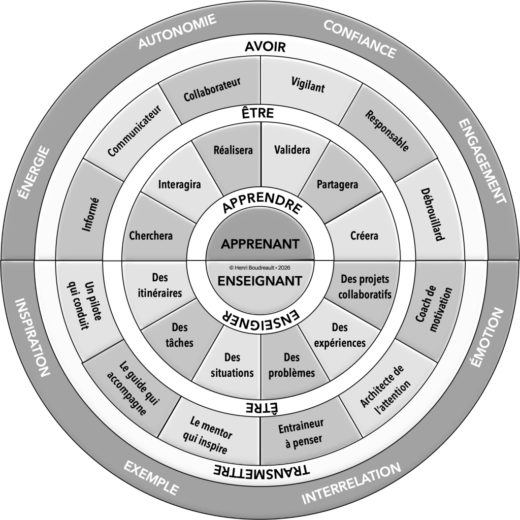 C’est dans cette optique que j’ai élaboré un modèle qui représente lia relation entre enseigner et apprendre telle qu’elle devrait être conçue à l’avenir. L’enseignement traditionnel est obsolète. Notre préoccupation ne devrait plus être d’enseigner les bonnes matières aux élèves, mais plutôt de leur apprendre à analyser les situations et à poser les questions pertinentes pour apprendre à leur façon. Les réponses sont déjà accessibles par le biais du numérique et de l’intelligence artificielle de manière significativement plus efficace que ce qu’un enseignant peut fournir. Faites-en l’expérience.