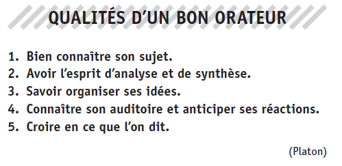 En ce qui concerne l’art oratoire,faut pas ignorer les principes grammaticaux:les règles,les constructions stylistiques,de plus,il tenir compte de l’auditoire également.Et enfin,tous les meilleurs orateurs savent qu’ils doivent préparer leur exposé.